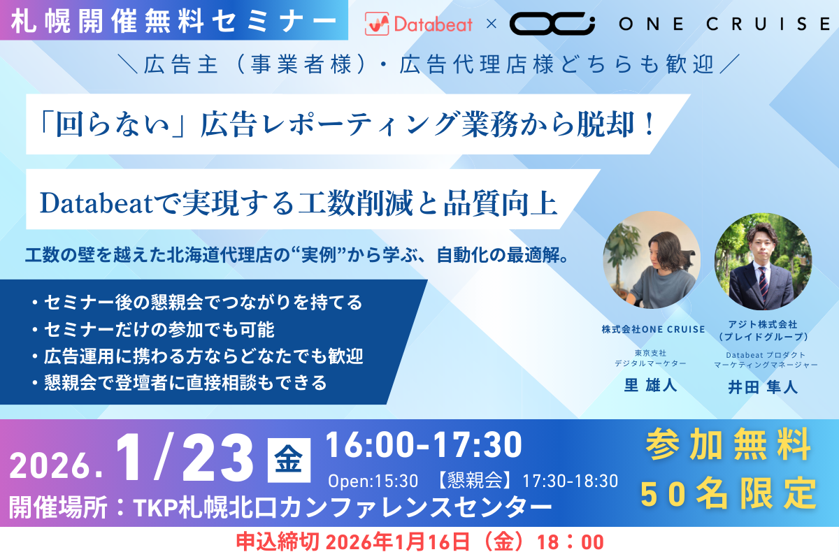 本セミナーは、広告レポート自動化ツール「Databeat」を提供するアジト株式会社と、実際にDatabeatを活用し、レポーティング業務の効率化・品質向上を実現してきた株式会社ONE CRUISEによる共催無料セミナーです。
